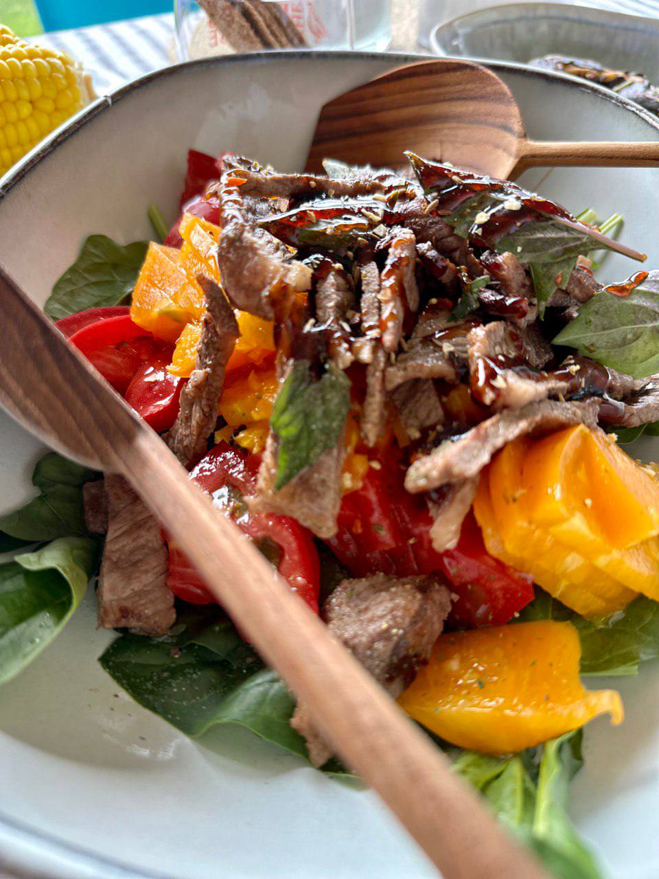 - Помидоры, шпинат, жареный стейк «Мираторг Минутка» (стоит 200руб), его готовим около 1 минуты на сильно разогретой сковороде, заправляем всё устричным соусом, после чего мясо отдыхает около минуты на доске, потом режем в салат.